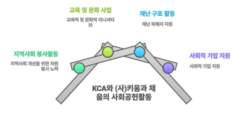 KCA는 산업의 발전과 함께 사회적 책임을 다하기 위해 다양한 사회공헌활동을 추진해왔습니다. 특히, 지역사회와의 상생을 중요하게 생각하며, 지역 주민들의 삶의 질 향상에 기여하고자 노력하고 있습니다. (사)키움과 채움은 사회적 취약계층을 지원하고, 교육 및 문화 사업을 통해 지역사회 발전에 기여하는 비영리 단체입니다. 양 기관은 이러한 공통된 목표를 바탕으로 협력하여 시너지 효과를 창출하고 있습니다.