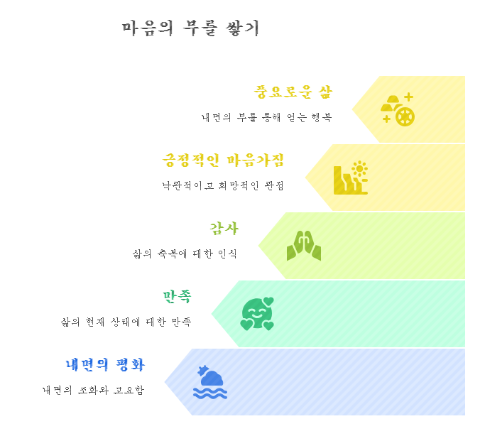 마음의 부는 물질적인 풍요로움보다 더 깊고 지속적인 행복을 가져다줍니다. 감사를 생활화하고, 현재에 집중하며, 나눔과 봉사를 실천하고, 긍정적인 마음을 유지하며, 배움을 멈추지 않는다면 당신은 이미 마음의 부자가 될 준비가 되어 있습니다. 지금부터 실천하여 더욱 풍요롭고 행복한 삶을 만들어가세요.