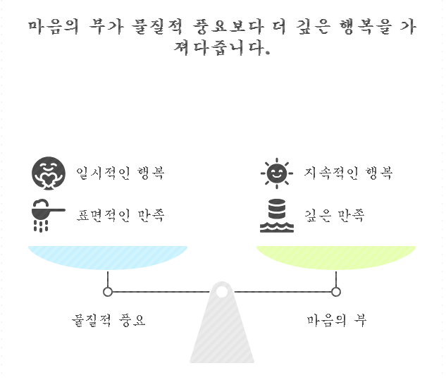 새로운 것을 배우고 성장하는 과정은 삶의 활력을 불어넣고, 마음을 풍요롭게 만들어줍니다. 배움을 멈추지 않고 꾸준히 성장하는 것은 마음의 부를 쌓는 중요한 요소입니다.