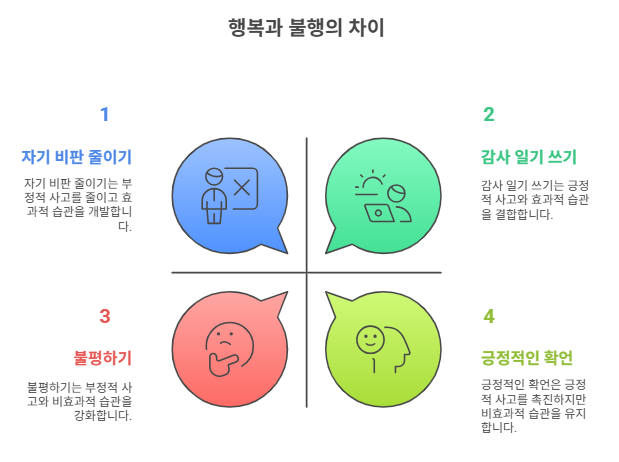 자기 연민 vs 자기 비판: 행복한 사람들은 자신에게 친절하고 관대하며, 실수를 통해 배우려고 노력합니다. 반면, 불행한 사람들은 자신을 가혹하게 비판하고 자책하며, 완벽주의적인 경향이 있습니다.