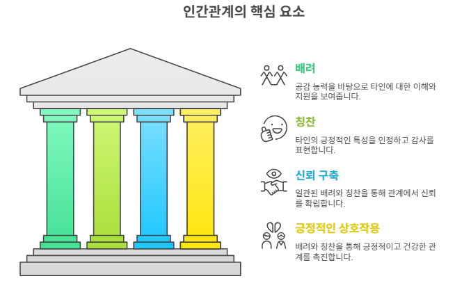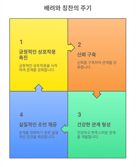 배려와 칭찬은 가정, 직장, 사회생활 등 다양한 상황에서 적용될 수 있습니다.