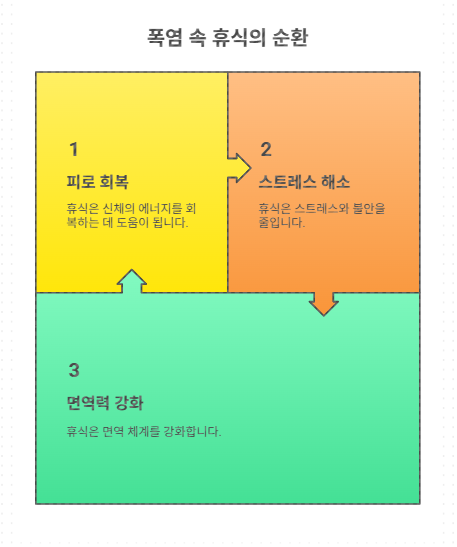 폭염 속에서 건강을 유지하는 데 있어 충분한 휴식은 매우 중요합니다. 휴식은 신체의 피로를 회복시키고, 스트레스를 해소하며, 면역력을 강화하는 데 필수적인 요소입니다.