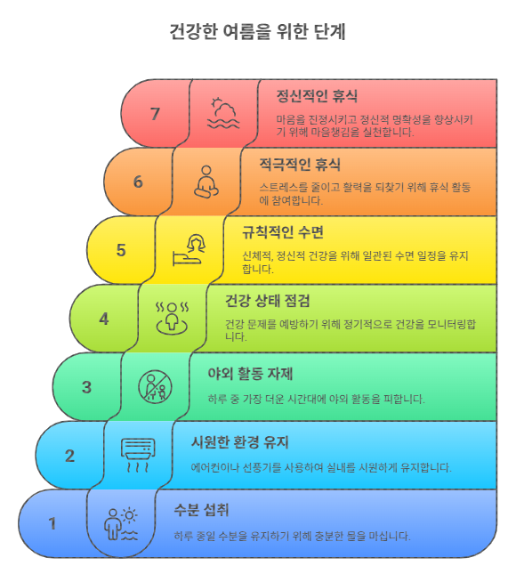 이 글에서 제시된 방법들을 실천하여 무더위 속에서도 건강하고 활기찬 생활을 유지하시기 바랍니다. 건강한 여름은 건강한 생활 습관에서 시작됩니다.