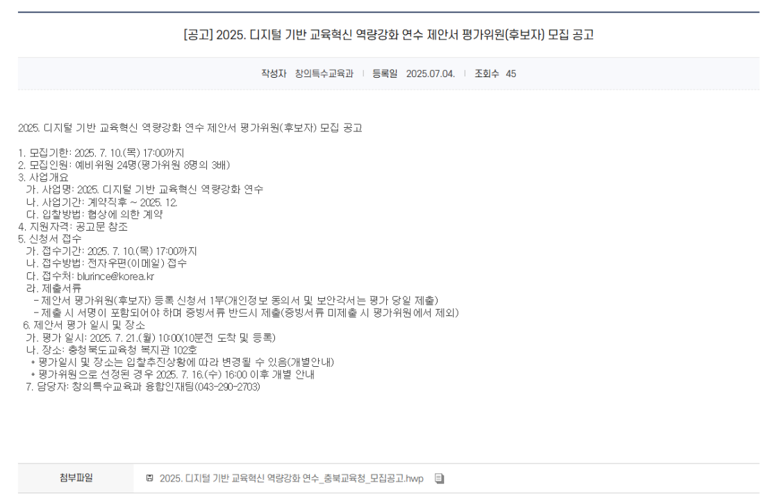공지 [7/10 마감] 충청북도교육청 2025 디지털 기반 교육혁신 역량강화 연수 제안서 평가위원 모집 공고