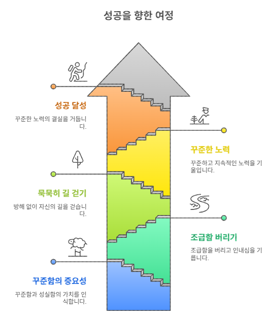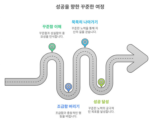 성공은 단거리 경주가 아니라 마라톤과 같습니다. 꾸준히 자신의 페이스를 유지하면서 묵묵히 나아가야 합니다. 때로는 넘어지고 좌절할 수도 있지만, 포기하지 않고 다시 일어서는 것이 중요합니다.