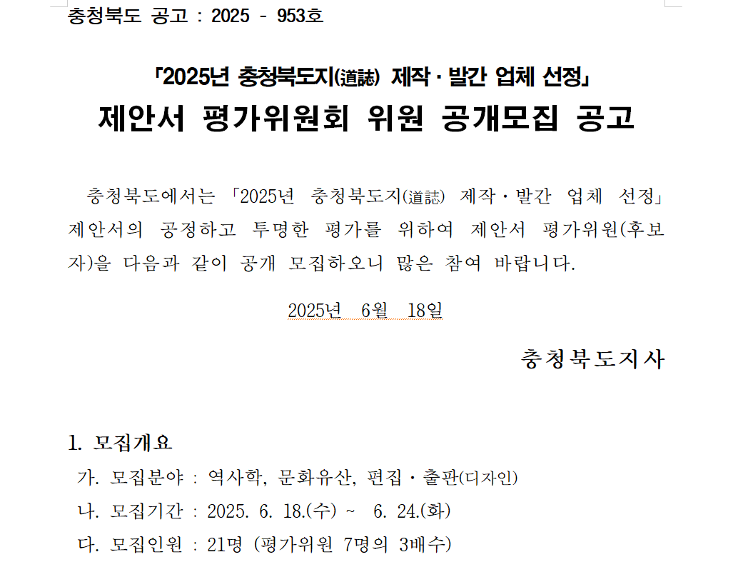 | 내용 | 충청북도에서는 「2025년 충청북도지(道誌) 제작·발간 업체 선정」 제안서의 공정하고 투명한 평가를 위하여 제안서 평가위원(후보자)을 다음과 같이 공개 모집하오니 많은 참여 바랍니다. 2025년 6월 18일 충청북도지사 | ||
