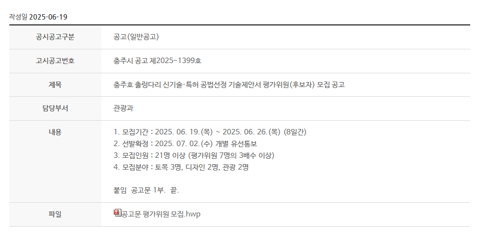 | 내용 | 1. 모집기간 : 2025. 06. 19.(목) ~ 2025. 06. 26.(목) (8일간) 2. 선발확정 : 2025. 07. 02.(수) 개별 유선통보 3. 모집인원 : 21명 이상 (평가위원 7명의 3배수 이상) 4. 모집분야 : 토목 3명, 디자인 2명, 관광 2명 붙임 공고문 1부. 끝. |