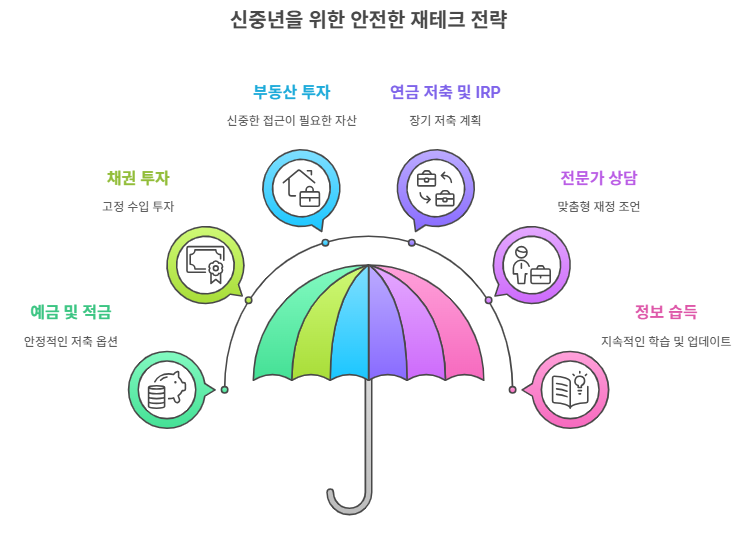 신중년 세대는 안전성을 최우선으로 고려하여 재테크 전략을 수립해야 합니다. 예금, 적금, 채권, 부동산 (신중한 접근), 연금 저축, IRP 등 다양한 방법을 활용하여 안정적인 노후 생활을 준비해야 합니다. 또한, 전문가 상담을 통해 자신에게 맞는 투자 전략을 수립하고, 꾸준히 재테크 관련 정보를 습득하는 것이 중요합니다.