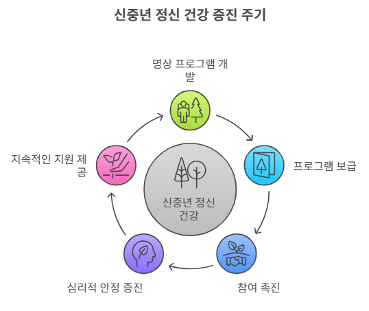 정부, 지자체, 관련 기관은 신중년 세대가 쉽게 참여할 수 있는 다양한 형태의 명상 프로그램을 제공하고, 숲과 명상을 결합한 치유 프로그램을 개발하여 신중년 세대의 심리적 안정과 행복 증진에 기여해야 합니다.