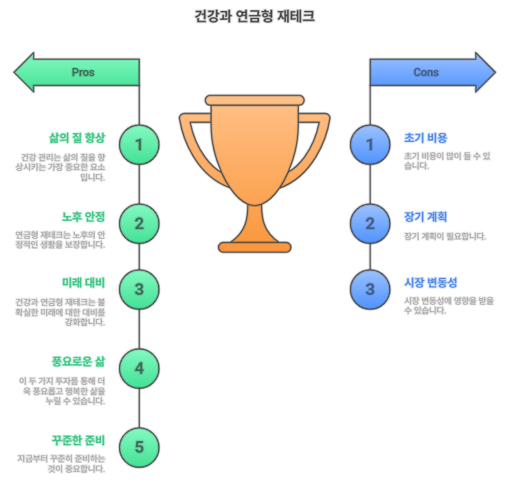 건강 관리와 연금형 재테크는 서로 시너지 효과를 낼 수 있습니다. 건강하게 오래 살수록 연금을 더 오래 받을 수 있으며, 건강한 노후 생활을 즐길 수 있습니다. 또한, 건강 관리를 통해 의료비 지출을 줄일 수 있으며, 연금형 재테크를 통해 안정적인 노후 생활을 보장받을 수 있습니다.