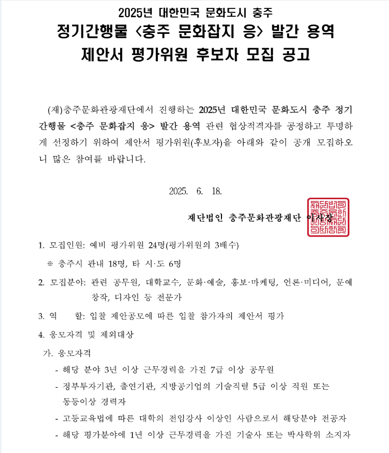 2025년 대한민국 문화도시 충주 정기간행물 발간 용역 제안서 평가위원 후보자 모집 공고