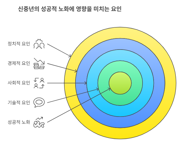신중년 세대는 정치적 환경의 변화에 큰 영향을 받습니다. 정부의 노인 복지 정책, 연금 제도, 건강 관리 시스템 등이 이들의 삶에 직접적인 영향을 미치며, 이러한 정책들이 성공적 노화에 기여하는 방식에 대해 논의합니다. 예를 들어, 연금 수령 연령의 변화나 건강 보험의 확대는 신중년의 경제적 안정성을 높여줍니다.