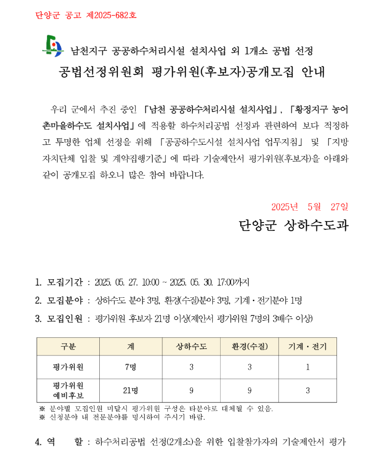공지 [5/30 마감] 충북 단양군 남천 공공하수처리시설 설치사업 외 1개 공법선정 제안서 평가위원(후보자)모집공고_상하수도, 환경…