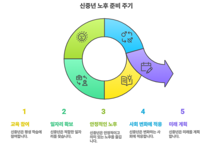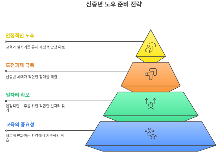신중년 세대의 노후 준비는 교육과 일자리의 결합을 통해 이루어져야 합니다. 지속적인 학습과 적절한 일자리 확보는 이들이 경제적 안정과 사회적 참여를 유지하는 데 필수적입니다. 따라서, 정부와 사회는 신중년을 위한 교육 기회와 일자리 창출에 더욱 힘써야 할 것입니다.