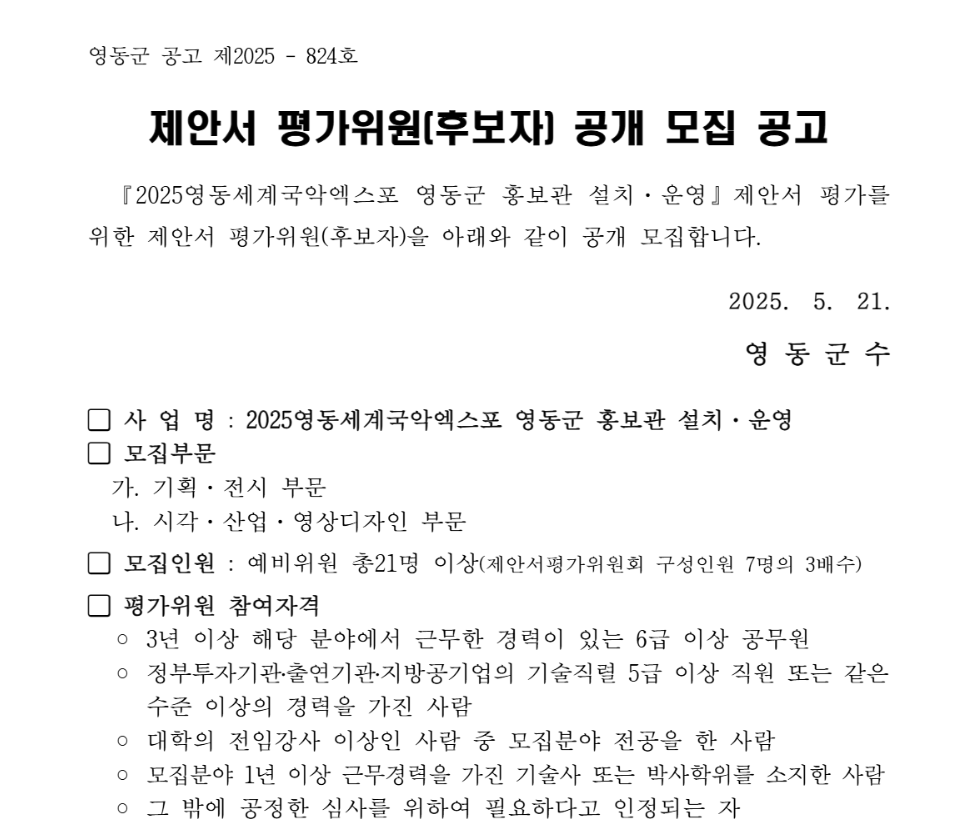 공지 [6/4 마감] 2025영동세계국악엑스포 영동군 홍보관 설치,운영 용역 제안서 평가위원(후보자) 모집 공고_모집부문: 기획, …