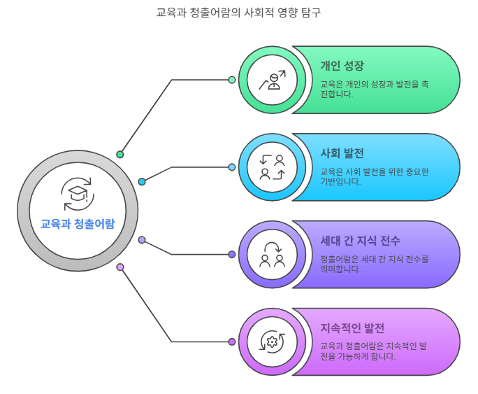 교육과 청출어람의 지속성은 사회 발전의 초석입니다. 지속적인 교육 시스템과 세대 간의 지식 전수는 사회가 변화하는 환경에 적응하고 혁신할 수 있는 기반을 제공합니다. 이를 통해 사회는 경제적, 사회적, 문화적 발전을 이룰 수 있으며, 이는 결국 모든 구성원의 삶의 질을 향상시키는 결과로 이어집니다.