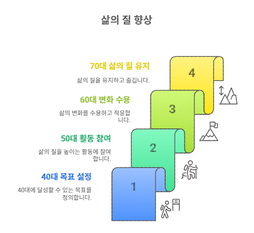 이 문서는 각 연령대별로 해야 할 일과 그 중요성을 다룹니다. 40대부터 70대까지의 삶은 다양한 변화와 도전이 있는 시기입니다. 이 시기에 어떤 목표를 설정하고, 어떤 활동을 통해 삶의 질을 높일 수 있는지에 대한 가이드를 제공합니다.