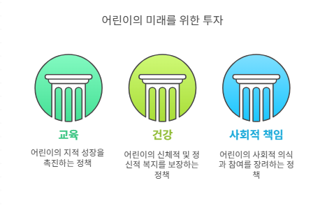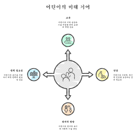 어린이는 대한민국의 미래를 밝히는 중요한 존재입니다. 그들의 교육, 건강, 그리고 사회적 책임을 강조하는 정책이 필요합니다. 어린이를 위한 투자는 곧 국가의 미래에 대한 투자이며, 이는 모든 세대가 함께 누릴 수 있는 더 나은 사회를 만드는 길입니다.
