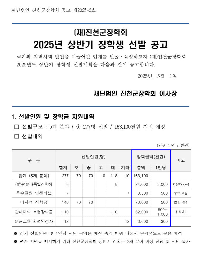 | (재)진천군장학회 2025년 상반기 장학생 선발 공고 | |||||