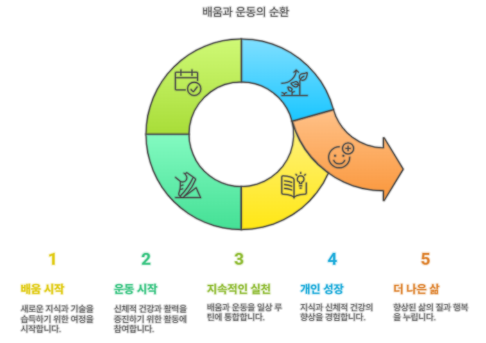 배움과 운동은 개인의 성장과 건강을 위한 필수 요소입니다. 이 두 가지 활동을 지속적으로 실천함으로써 우리는 더 나은 삶을 영위할 수 있습니다. 오늘부터라도 작은 변화로 시작해보세요. 배움과 운동을 멈추지 않는 삶이 여러분을 기다리고 있습니다.
