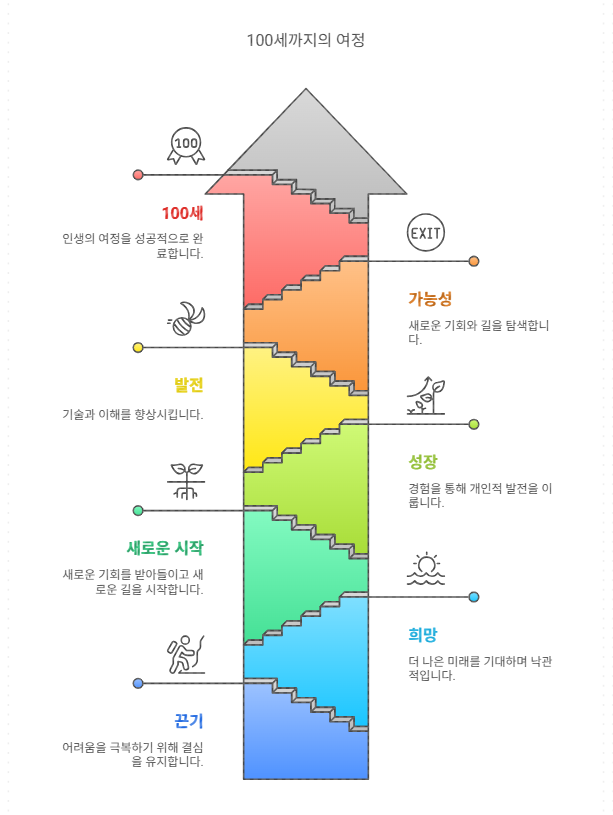 인생은 단순한 목표 달성이 아닌, 지속적인 성장과 변화의 과정입니다. 100세까지의 긴 여정 속에서 우리는 수많은 도전과 기회를 마주하게 됩니다. 이러한 경험들은 우리를 더욱 강하게 만들고, 새로운 가능성을 열어줍니다.