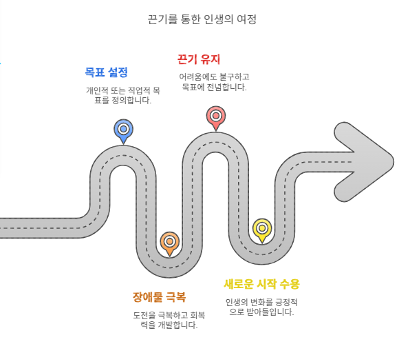 끈기는 인생에서 매우 중요한 요소입니다. 목표를 향해 나아가는 과정에서 우리는 여러 번의 실패와 좌절을 경험할 수 있습니다. 그러나 이러한 순간들이 우리를 정의하는 것이 아니라, 그 후 다시 일어서는 것이 진정한 의미의 성공입니다. "끝날때까지 끝난게 아니다"라는 말은 이러한 끈기의 중요성을 잘 나타냅니다.