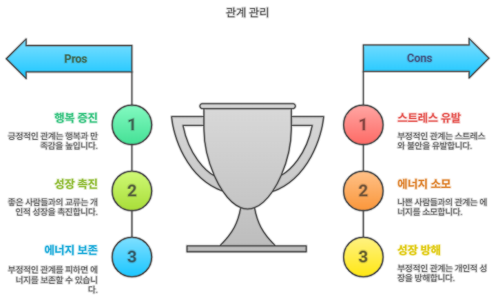 이 문서는 좋은 사람들과의 관계를 강화하고, 나쁜 사람들과의 관계를 멀리하는 방법에 대해 다룹니다. 사람들과의 관계는 우리의 삶에 큰 영향을 미치며, 긍정적인 사람들과의 교류는 우리의 행복과 성장을 촉진합니다. 반면, 부정적인 사람들은 우리의 에너지를 소모하고 스트레스를 유발할 수 있습니다. 따라서, 이 문서에서는 좋은 사람을 가까이 두고 나쁜 사람을 멀리하는 구체적인 전략을 제시합니다.