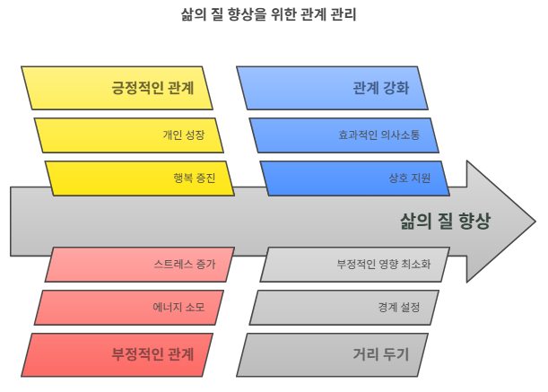 좋은 사람들과의 관계를 강화하고, 나쁜 사람들과의 관계를 멀리하는 것은 우리의 삶의 질을 높이는 중요한 과정입니다. 긍정적인 사람들과의 교류는 우리의 행복과 성장을 촉진하며, 부정적인 사람들은 우리의 에너지를 소모할 수 있습니다. 따라서, 이 문서에서 제시한 방법들을 통해 더 나은 인간관계를 형성해 나가길 바랍니다.