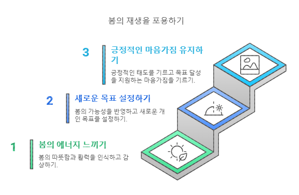 새로운 각오를 다지기 위해서는 긍정적인 마음가짐이 필수적입니다. 봄의 따뜻한 기운을 느끼며, 자신에게 긍정적인 말을 건네고, 작은 성취를 축하하는 습관을 들여보세요. 이러한 마음가짐은 목표를 이루는 데 큰 도움이 됩니다.