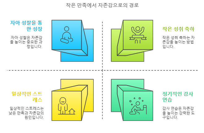 만족감은 자존감의 중요한 요소입니다. 작은 것에서 오는 만족감은 우리가 스스로를 긍정적으로 바라보게 만들고, 이는 자존감의 향상으로 이어집니다. 예를 들어, 일상에서 작은 목표를 설정하고 이를 달성했을 때 느끼는 성취감은 자존감을 높이는 데 큰 역할을 합니다. 이러한 작은 성공 경험들은 우리의 자기 효능감을 강화하고, 더 큰 도전에도 긍정적인 태도로 임할 수 있게 합니다.