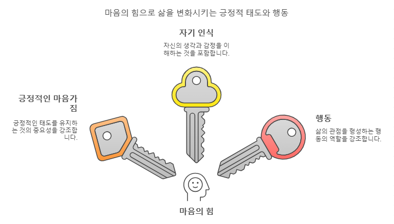 마음은 우리의 행동과 선택에 큰 영향을 미칩니다. 긍정적인 마음가짐은 어려운 상황에서도 희망을 잃지 않게 하고, 도전적인 목표를 향해 나아갈 수 있는 원동력이 됩니다. 반면, 부정적인 생각은 우리를 움츠러들게 하고, 기회를 놓치게 만들 수 있습니다. 따라서 마음의 힘을 이해하고 이를 긍정적으로 활용하는 것이 중요합니다.