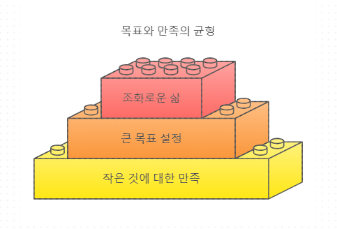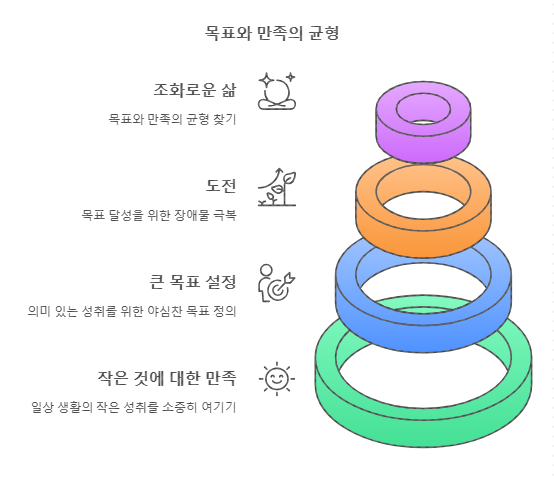 결국, 큰 목표와 작은 것에 대한 만족은 상호 보완적인 관계에 있다. 큰 목표를 향해 나아가면서도, 작은 성취와 일상의 소소한 행복을 놓치지 않는 것이 중요하다. 이를 통해 우리는 더 균형 잡힌 삶을 살 수 있으며, 목표를 향한 여정에서 더욱 풍요로운 경험을 할 수 있다.