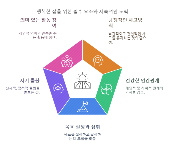 행복한 삶을 위해서는 긍정적인 사고방식, 건강한 인간관계, 목표 설정과 성취, 자기 돌봄, 의미 있는 활동 참여가 필수적입니다. 이러한 요소들을 통해 개인은 더 만족스럽고 의미 있는 삶을 영위할 수 있습니다. 행복은 단순한 감정이 아니라, 지속적으로 노력하고 가꾸어 나가야 할 삶의 방식임을 잊지 말아야 합니다.
