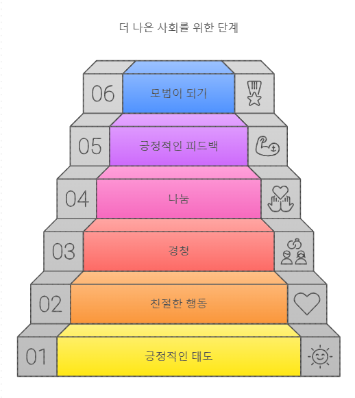 긍정적인 태도는 주변 사람들에게 큰 영향을 미칩니다. 어려운 상황에서도 긍정적인 시각을 유지하면, 타인에게도 희망과 용기를 줄 수 있습니다. 일상에서 작은 일에도 감사하는 마음을 가지면, 그 에너지가 주변으로 퍼져나갑니다.