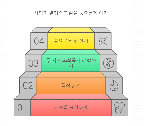 사랑과 열정은 서로를 보완하는 관계입니다. 사랑하는 사람과 함께 열정을 공유하고, 서로의 꿈을 응원하는 것이 중요합니다.