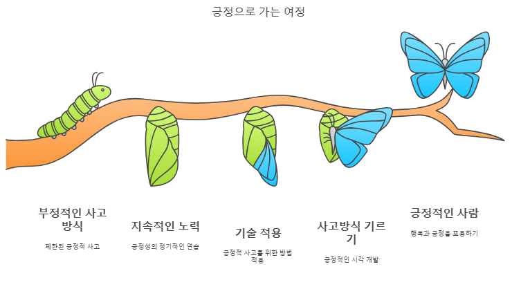 긍정적인 사람이 되는 것은 하루아침에 이루어지는 일이 아닙니다. 꾸준한 노력과 연습이 필요합니다. 위의 방법들을 실천하며 긍정적인 사고방식을 기르고, 더 행복한 삶을 만들어 가세요.
