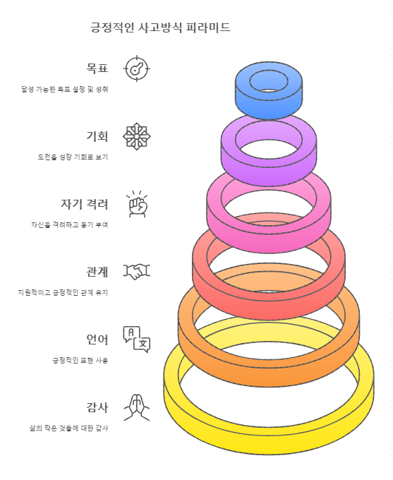 긍정적인 사람들과의 관계를 유지하는 것이 중요합니다. 주변에 긍정적인 에너지를 주는 사람들과 함께 시간을 보내면, 자연스럽게 긍정적인 사고방식이 형성됩니다.