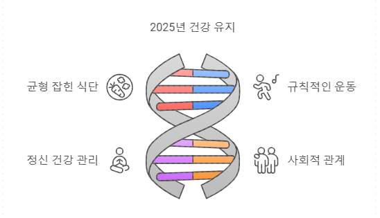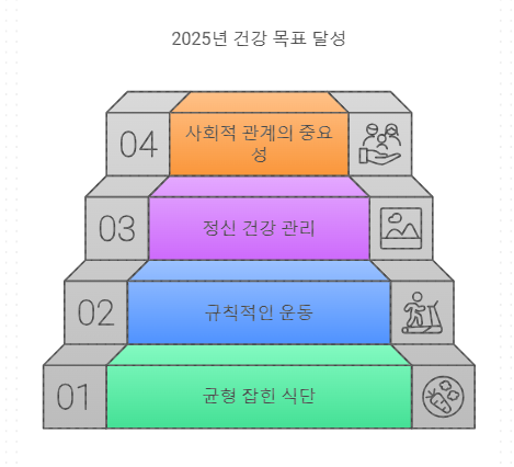 2025년을 건강하게 보내기 위해서는 균형 잡힌 식단, 규칙적인 운동, 정신 건강 관리, 그리고 사회적 관계의 중요성을 인식하고 실천하는 것이 필요합니다. 이러한 요소들을 통해 건강한 삶을 유지하고, 더 나아가 행복한 삶을 영위할 수 있습니다.