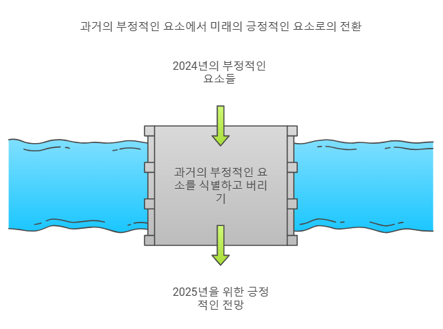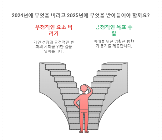 2024년은 과거의 부정적인 요소를 정리하고, 2025년에는 새로운 출발을 위한 준비를 하는 중요한 시기입니다. 우리가 버려야 할 것들을 명확히 하고, 새로운 목표와 긍정적인 태도로 나아간다면 더 나은 미래를 맞이할 수 있을 것입니다. 변화는 두려운 것이 아니라, 성장의 기회임을 잊지 말아야 합니다.