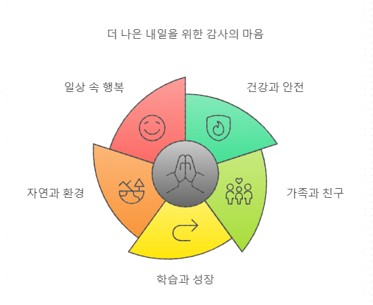 매일의 일상 속에서 느낄 수 있는 작은 행복들, 예를 들어 맛있는 음식, 좋은 책, 혹은 따뜻한 커피 한 잔과 같은 것들에 감사합시다. 이러한 소소한 것들이 우리의 삶을 더욱 풍요롭게 만들어 줍니다.