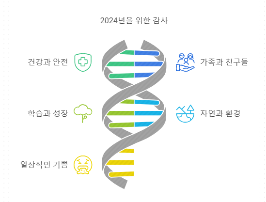 가장 기본적이면서도 중요한 것은 우리의 건강입니다. 2024년 동안 건강을 유지할 수 있었던 것에 대해 감사해야 합니다. 또한, 안전한 환경에서 생활할 수 있었던 것 역시 큰 축복입니다. 이러한 요소들은 우리가 일상생활을 영위하는 데 필수적입니다.