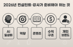 2026년을 기준으로 **컨설턴트·강사(교육자)**가 준비해야 할 핵심을 환경 변화 → 역량 → 콘텐츠 → 수익 구조 → 개인 브랜드 순으로 정리해 드릴게요.