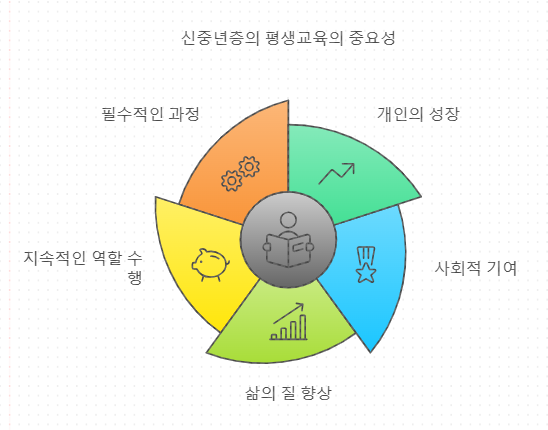 신중년층은 직업적 변화와 은퇴 준비 등 다양한 도전에 직면해 있습니다. 이러한 변화에 적응하기 위해서는 새로운 기술과 지식을 습득하는 것이 필수적입니다. 평생교육은 신중년이 자신의 경력을 재정립하고, 사회적 역할을 지속적으로 수행할 수 있도록 돕는 중요한 수단입니다.