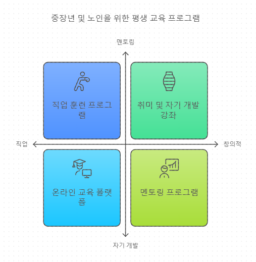 경력 개발: 신중년층은 새로운 직업 기회를 탐색하거나 현재의 직업에서 더 나은 성과를 내기 위해 필요한 기술을 배울 수 있습니다.