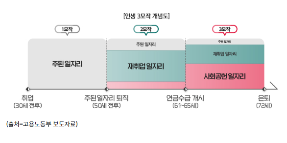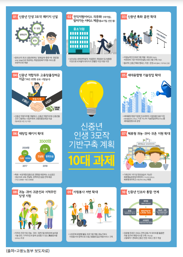 정부는 2017년 6월 일자리위원회에서 마련한 「일자리 100일 계획」에 따라, 같은 해 8월 「신중년 인생3모작 기반구축 계획」을 마련했다.