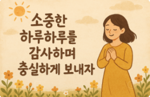 → 우리가 살아가는 매일매일이 당연한 것이 아니라, 귀하고 값진 시간이라는 인식입니다. 하루하루를 소중히 여긴다는 것은 그 시간을 헛되이 보내지 않겠다는 다짐이기도 합니다.감사하며