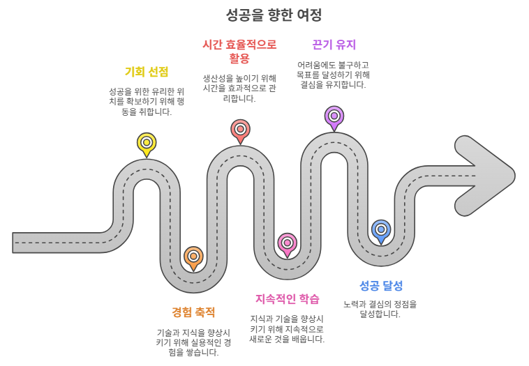 끈기와 인내: 성공은 단기간에 이루어지는 것이 아닙니다. 어려움과 실패에 굴하지 않고, 끈기와 인내를 가지고 꾸준히 노력해야 합니다. 포기하지 않고 목표를 향해 나아가는 정신력이 중요합니다.