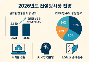 2026년 컨설팅 시장은 글로벌 및 국내 모두 안정적 성장세를 이어갈 것으로 전망됩니다. 주요 포인트를 정리하면 다음과 같습니다: