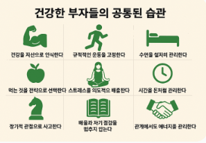‘건강하면서 부유한 사람들(지속적으로 성과를 내는 고자산·고성과 집단)’에게서 반복적으로 관찰되는 공통 습관을 정리한 것입니다. 특정 개인을 미화하기보다는, 장기적으로 검증된 행동 패턴에 초점을 맞췄습니다.